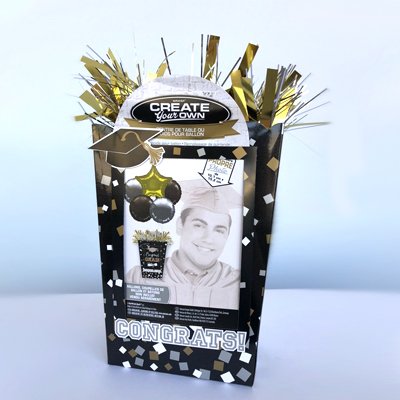 Стильный аксессуар для выпускных. Грузик удерживает букет до 5 фольгированных шаров (1 фигура, 4х 18" шара). Внутри картонной коробки с блестящим дождём сверху пластмассовая сетка с крючком. Есть два варианта как закрепить шарики: подвязать их к сетке или крючку, или вставить шарики на палочке в специальные отверстия в этой сетке. Также с двух сторон этого грузика есть окошки для фото радостного выпускника или его класса. Размер фото: 10,1 см х 15, 2 см (вертикальный формат фото). Цвет: черный.
